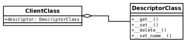 ClientClass: The domain-level abstraction that will take advantage of the functionality to be implemented by the descriptor. This class is said to be a client of the descriptor. This class contains a class attribute (named descriptor by this convention), which is an instance of DescriptorClass.