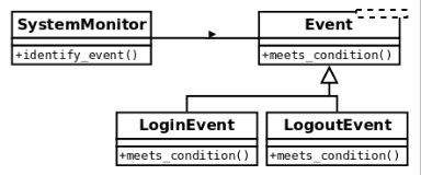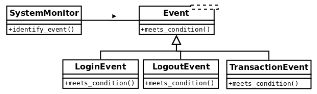 The idea is that we have a part of the system that is in charge of identifying events as they occur in another system, which is being monitored. At each point, we want this component to identify the type of event, correctly, according to the values of the data that was previously gathered (for simplicity, we will assume it is packaged into a dictionary, and was previously retrieved through another means such as logs, queries, and many more). We have a class that, based on this data, will retrieve the event, which is another type with its own hierarchy.