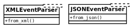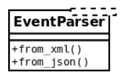 Now, we want to be able to parse an event from several data sources, in different formats (XML and JSON, for instance). Following good practice, we decide to target an interface as our dependency instead of a concrete class, and something like the following is devised: